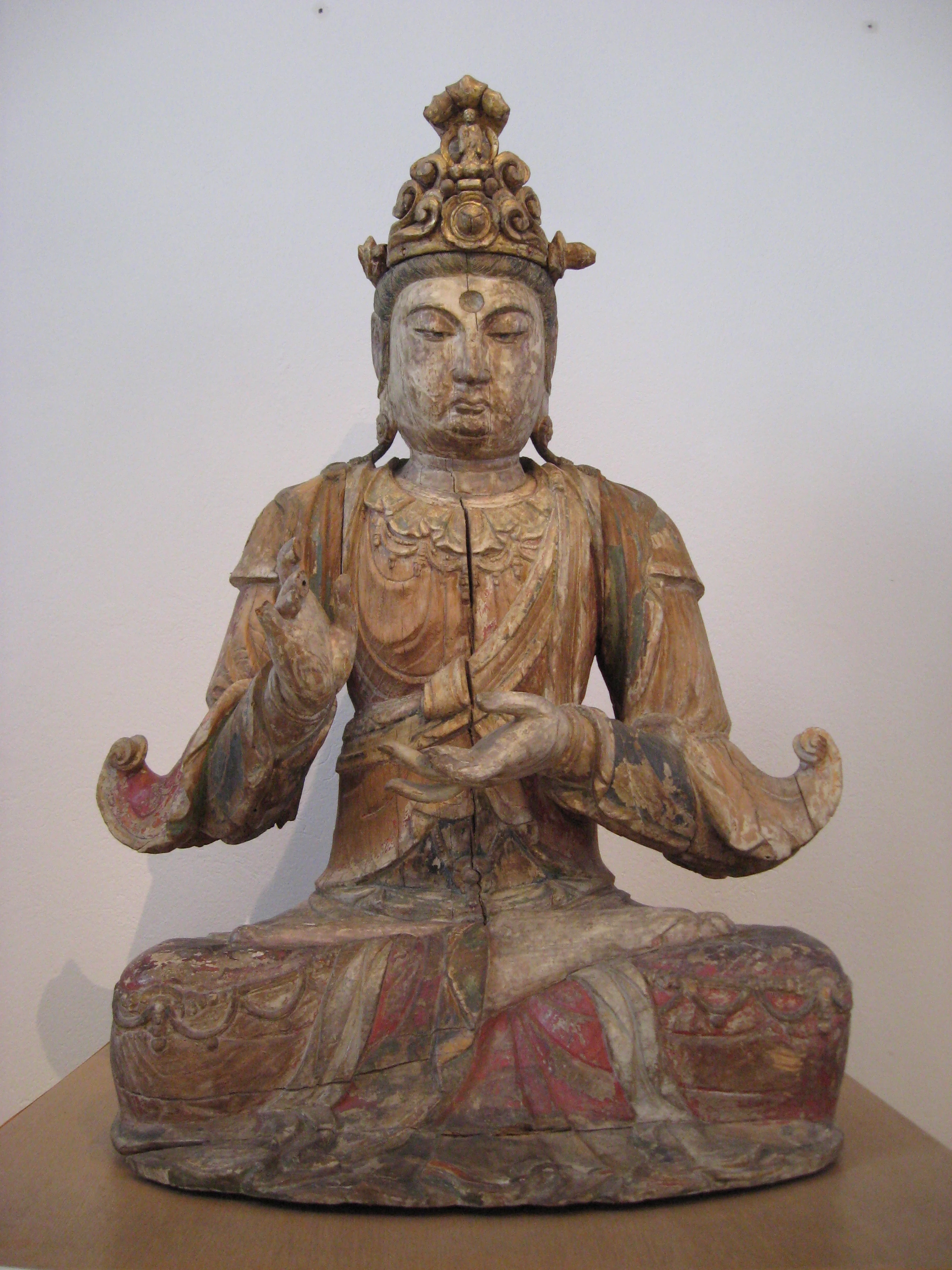 Guanyin, sentado en la posición del loto. Las maños dañadas posiblemente realizaban el dharmacakramudra, un gesto que significaba el momento cuando buda pone en movimiento la rueda del aprendizaje. Pintado y madera dorada. China. Periodo Song/Jin, finales del siglo XIII.