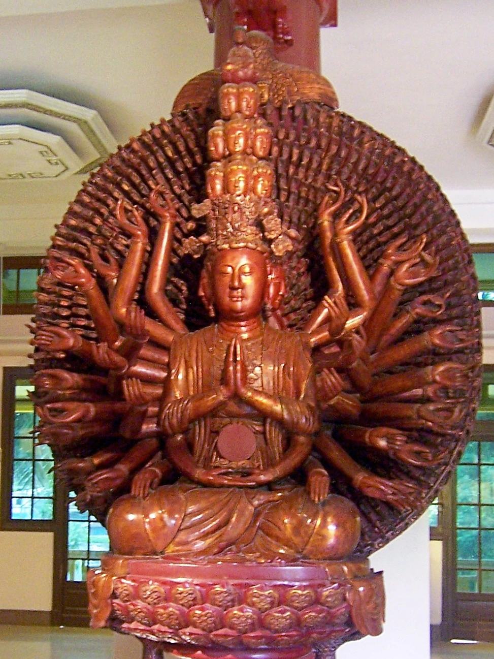 Una leyenda budista del Relato completo de Guan Yin y los mares del sur (Chino: 南海觀音全撰; pinyin: Nánhǎi Guānyīn Quánzhuàn) presenta a Guan Yin jurando nunca descansar hasta haber liberado a todos los seres inteligentes del saṃsāra o ciclo de renacimiento.[14] A pesar de sus constantes esfuerzos, se dio cuenta de que aún había demasiadas criaturas infelices que salvar. Tras tener dificultades para cubrir las necesidades de tantos, su cabeza se dividió en once piezas. El buda Amitābha, al ver su situación, le dio once cabezas para ayudarle a oír los llantos de aquellos que sufrían. Al oír esos llantos y comprenderlos, Avalokitesvara intentó alcanzar a todos los que necesitasen ayuda, pero encontró que sus dos brazos se rompieron en trozos. Una vez más, Amitābha le ayudó y le dio mil brazos para alcanzar a los necesitados.