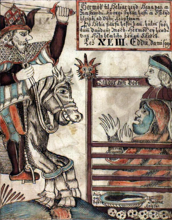 Ilustración de un manuscrito de la Edda prosaica del siglo XVIII mostrando a Hermóðr sobre Sleipnir (izquierda), Baldr (arriba a la derecha) y Hela (abajo a la derecha). Los detalles incluyen al plato "hambre" y el cuchillo "hambruna" de Hela.