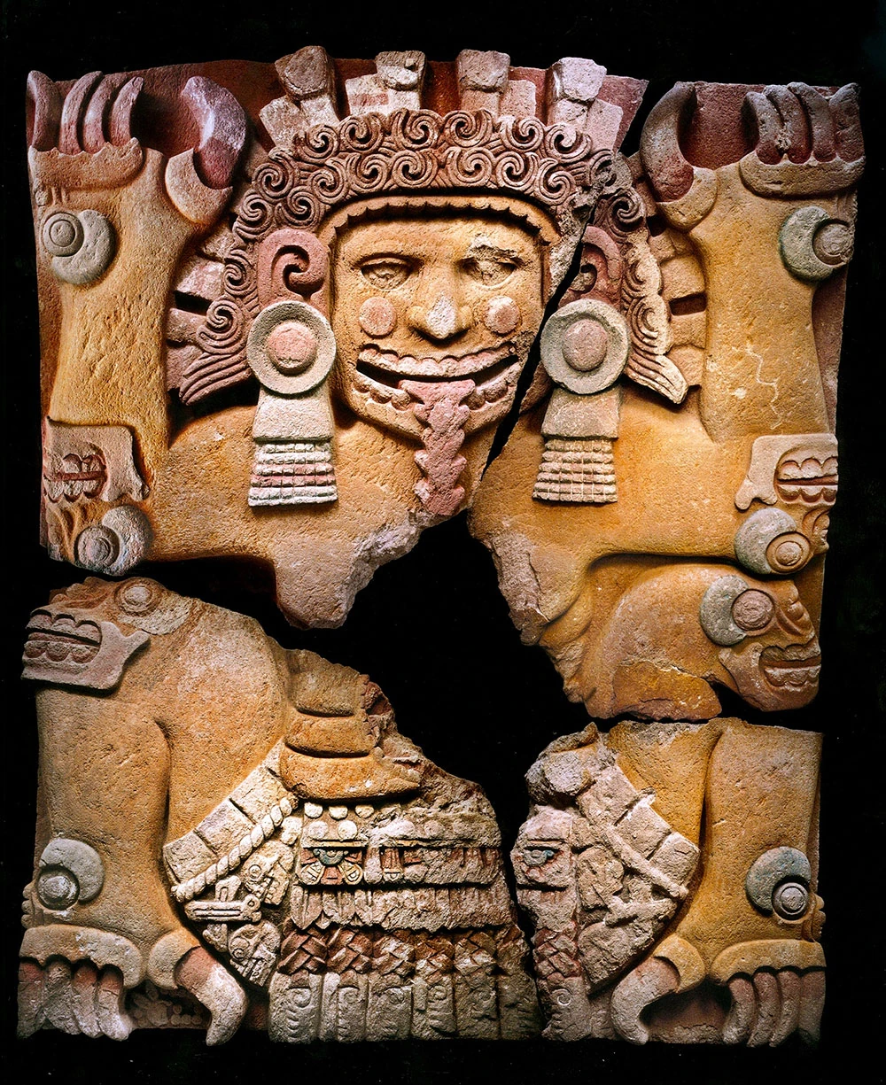 Antropomorfismo masculino de Tlaltecuhtli encontrado en Tenochtitlán (ca. 1500), llevando una máscara maxtlatl masculina.