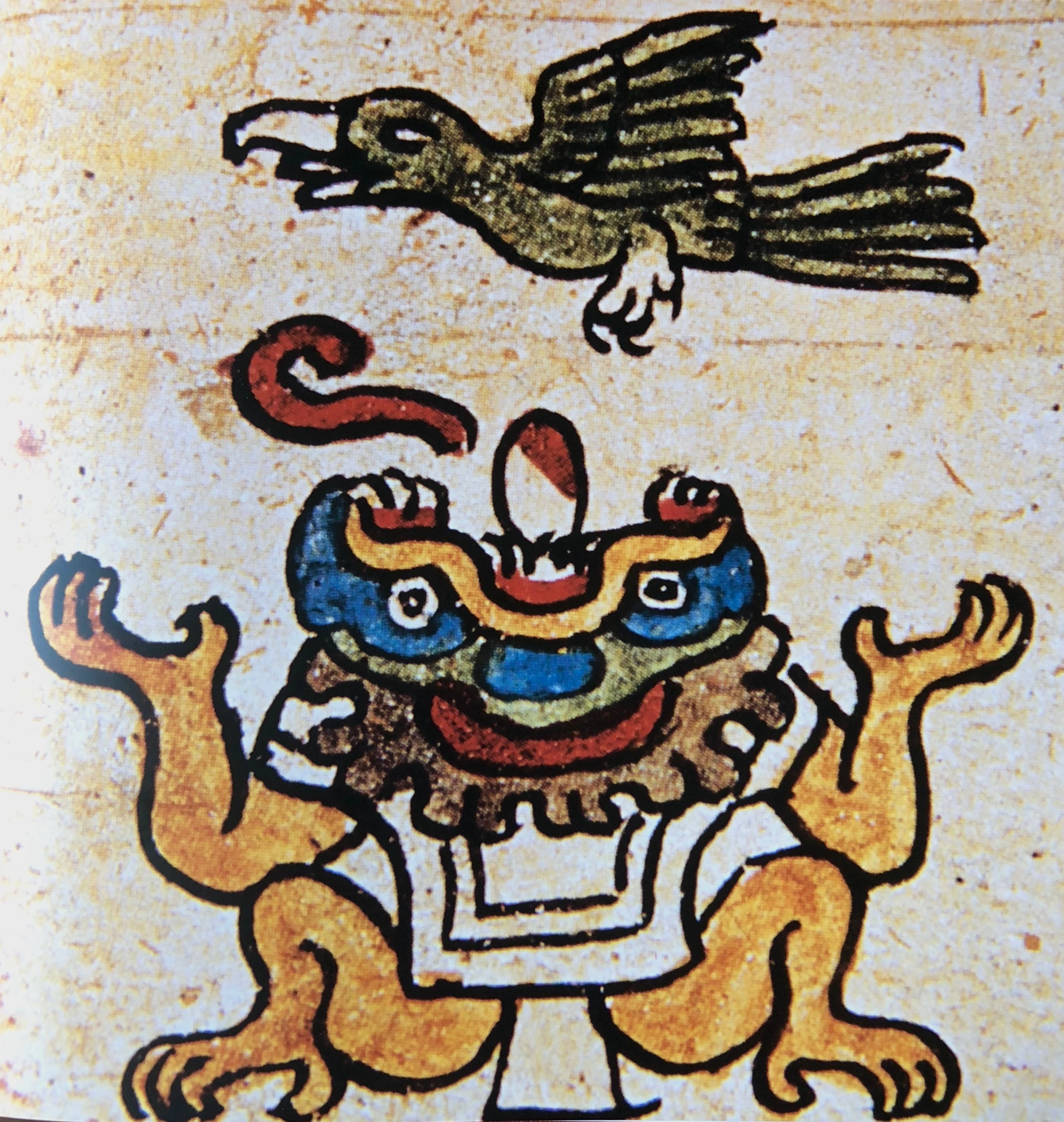 Representación de Tlaltecuhtli en el Códice Borbónico (ca. 1520), mostrando un cuchillo de pedernal entre sus dientes.