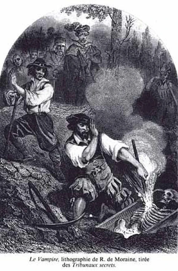 Los vampiros propiamente dichos se originaron en el folclore de Europa del este a finales de los siglos XVII y XVIII. Estas leyendas fueron los cimientos de las leyendas de los vampiros que luego se introdujeron en Alemania e Inglaterra, donde fueron embellecidas y popularizadas. Uno de los registros más antiguos de actividad vampírica viene de la región de Istria en la moderna Croacia en 1672.[66] Los informes locales citan al vampiro local Jure Grando del pueblo de Khring cerca de Tinjan como la causa del pánico entre los aldeanos.[67] Un antiguo habitante, Jure, murió en 1656; sin embargo, los lugareños afirmaron que volvió de entre los muertos y empezó a beber sangre de la gente y acosar sexualmente a su viuda. El jefe de la aldea ordenó estacar al fallecido en el corazón, pero cuando esto no lo paró, lo decapitaron para obtener mejores resultados.[68] Es el primer caso de una persona real descrita como un vampiro.